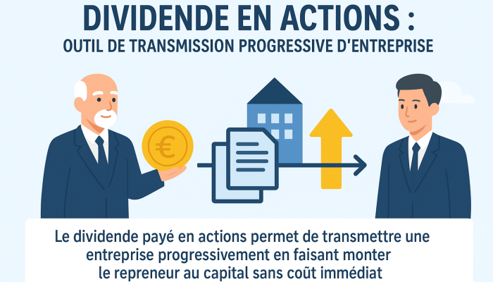 Le dividende payé en actions permet de transmettre une entreprise progressivement en faisant monter le repreneur au capital sans coût immédiat, tout en maintenant le contrôle et les avantages fiscaux du dirigeant.
